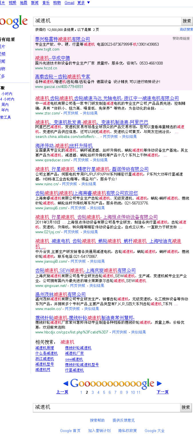 最近,公司網站排名上升瞭一些。輸入關鍵詞“減速機”,本公司網站在谷歌的結合排名在第16位,目前位於搜索結果的第二頁中間。随著公司業務的提升 ,網站會有更好的排名。也謝謝各位朋友對本公司支持與幫助,謝謝。