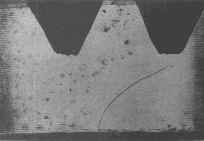 在大齒輪齒頂形成的淬火裂紋(這種裂紋通常都在這個區域出現)。