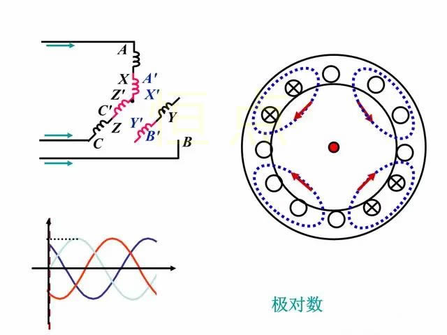 如果A、B、C三相繞組每相分别由兩個線圈串聯組成,每個線圈的跨距爲1/4圓周 ,那麽三相電流所建立的合成磁場仍然是一個旋轉磁場,並(bìng)且電流變(biàn)化一次,旋轉磁場僅轉過1/2轉,這就是2對極。同理,如果将繞組按一定的規則排列,可得3對極、4對極或一般地說P對極。P就是極對數。