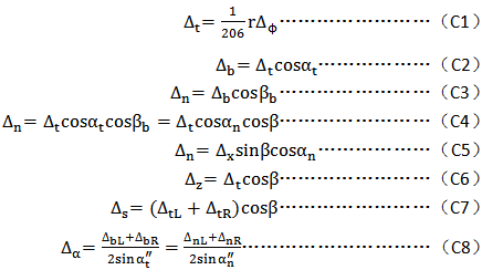 C2齒輪各項誤差應按下述規定的方向計值:Δfpb、ΔFb、ΔFpX、Δffβ、ΔFw、ΔEwm、jn在齒面法線方向計值;ΔFi′、Δfi′、ΔFp、ΔFpk、Δfpt、ΔFβ、ΔFic′、Δfic′、jt在分度圓切線方向計值;Δff在基圓切線方向計值;ΔFr、ΔFi″、Δfi″、ΔEα″和ΔEH在雙側齒面徑向計值;ΔEs在雙側齒面分度圓螺旋線的法線方向計值。