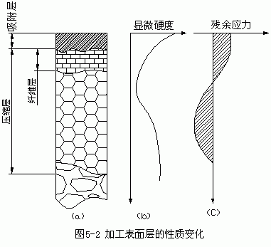 表面層的物理力學性能包括表面層的加工硬化、殘餘應力和表面層的金相組織變化。機械零件在加工中由於受切削力和熱的綜合作用,表面層金屬的物理力學性能相對於基本金屬的物理力學性能發生瞭(le)變化。圖 5— 2a所示爲零件表面層沿深度方向的變化。最外層生成有氧化膜或其他化合物,並(bìng)吸收、滲進氣體粒子,稱爲吸附層。吸附層下是壓縮層,它是由於切削力的作用造成的塑性變形區,其上部是由於刀具的擠壓摩擦而産生的纖維層。切削熱的作用也會使工件表面層材料産生相變及晶粒大小變化。