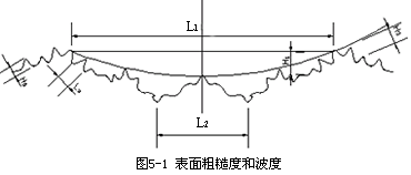 加工表面的微觀幾何特征主要包括表面粗糙度和表面波度兩部分組成,如圖 5— 1所示 。表面粗糙度是波距 L小於(yú) 1mm的表面微小波紋;表面波度是指波距 L在 1~ 20mm之間的表面波紋 。通常情況下,當(dāng) L/H(波距 /波高)﹤ 50時爲表面粗糙度, L/H=50~ 1000時爲表面波度。