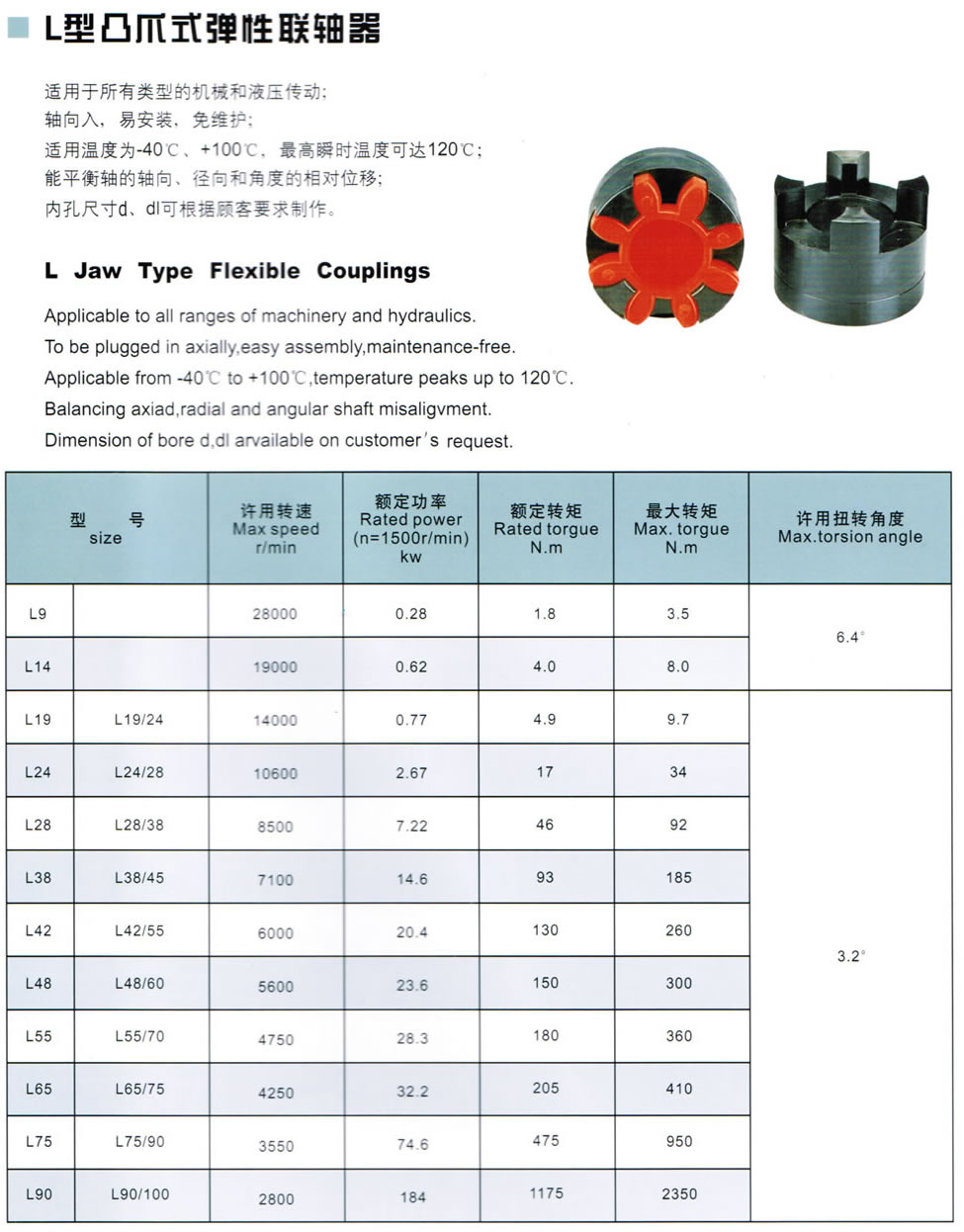 L型凸爪式彈性聯軸器适用於所有類型的機械和液壓傳動;軸向入,易安裝,免維 護;适用溫度爲-40度 ,+100度,最高瞬時溫度可達120度; 能平衡軸的軸向,徑向和角度的相對位移;内孔尺寸d,d1可 根據顧客要求制作。