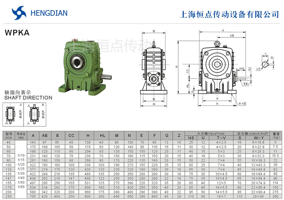 WPKA系列蝸輪蝸杆減速機的外形尺寸及安裝尺寸.機座号從40到250,可選速比從10到60.WPKA減速機軸輸入,孔輸出.WPA系列蝸輪蝸杆減速機選型指南,選型方法,WPKA減速機軸指向表示方法