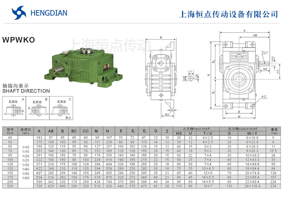 WPWKO萬能型蝸輪蝸杆減速機選型指南,WPWKO萬能型減速機軸輸入,孔輸出.WPWKO萬能型減速機軸指向表示方法.機座号40到250,速比10到60.WPWKO減速機的外形安裝尺寸