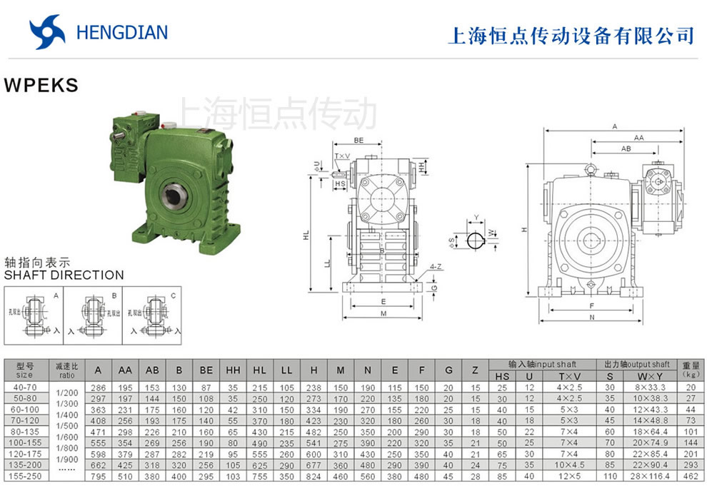 WPEKS雙級蝸輪蝸杆減速機選型指南,WPEKS雙級減速機的外形安裝尺寸.WPEKS雙級減速機軸輸入,孔輸出.WPEKS雙級減速機軸指向表示方法.機座号40-70到155-250,速比200到900.